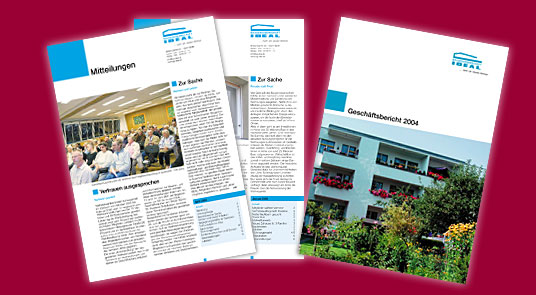 Gestaltung nach gelieferten Texten und Bildmaterial sowie Scribble; die Mitteilungen erscheinen Quartalsweise, der Geschäftsbericht jährlich